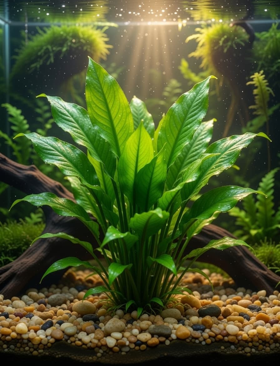 Check Amazon SwordThe Amazon Sword is a classic centerpiece plant that can grow impressively large with its broad, bright green leaves radiating from a central crown. It is a heavy root feeder that benefits greatly from nutrient-rich substrate or root tabs. Given adequate nutrition, it will produce runners with new plantlets, eventually filling the background of a large aquarium.