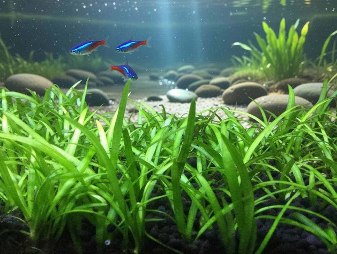 Check Dwarf SagittariaDwarf Sagittaria is a grass-like plant that creates a beautiful, natural-looking carpet or midground accent without the demanding requirements of other carpeting species. It spreads via runners and can form a dense lawn under moderate lighting without CO2 injection. Its narrow, arching leaves sway gently in the current, adding graceful movement to any aquascape.