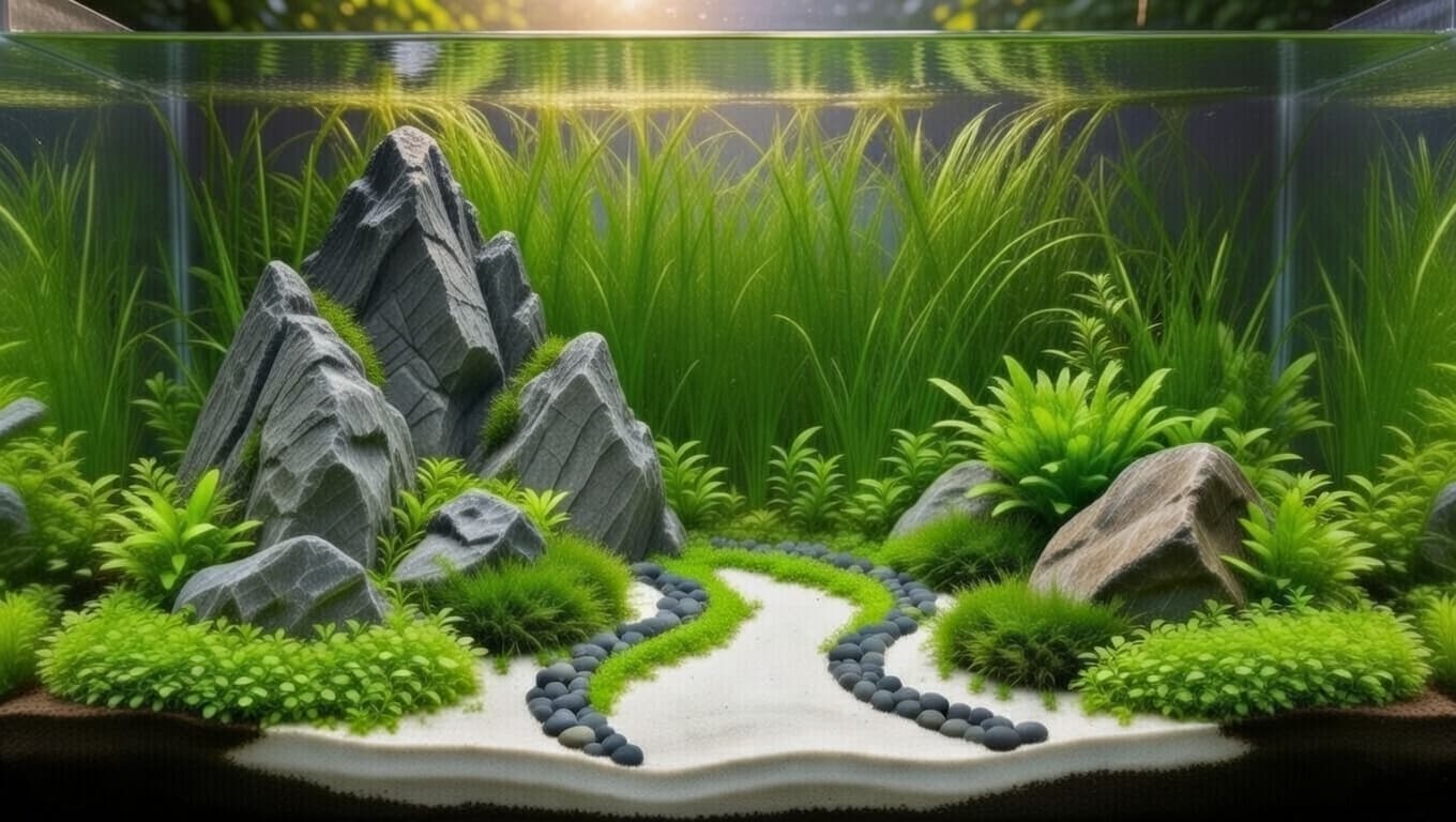 Check Iwagumi Zen Garden TankA minimalist aquascape inspired by Japanese rock gardens, featuring carefully arranged stones as the focal point with a lush green carpet of low-growing plants. The Iwagumi style follows strict compositional rules, typically using an odd number of stones with one dominant "father" stone. This scape creates a serene, meditative atmosphere that showcases the beauty of simplicity.